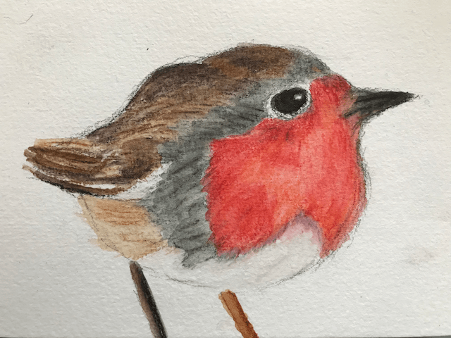 Returning to my childhood subject, a robin. I did this with some “inktense” watercolour pencils. Robins are a fixture in my garden…bold and noisy.
