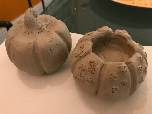 My daughter joined me in making her own pottery pumpkin, I particularly love the stalk. I attempted a tea light holder. I tried to create the lumpy texture on the skin. Figuring out how large the hole for the tealight should be was tricky…and I didn’t get it quite right!
