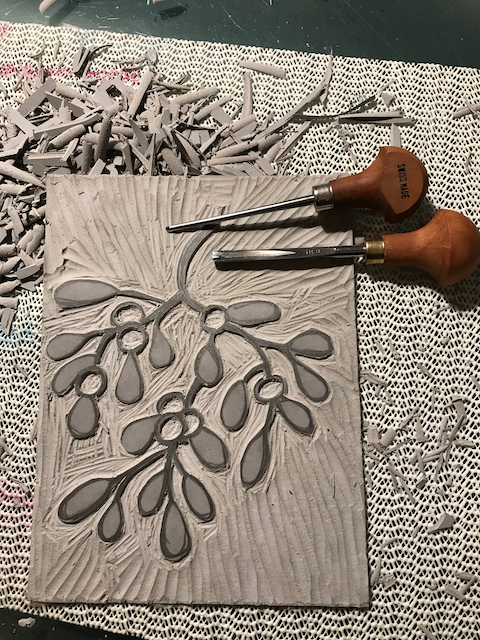 I transferred my sketch onto the lino with tracing paper and then started shaving away. I always find it difficult to get fine outlines.