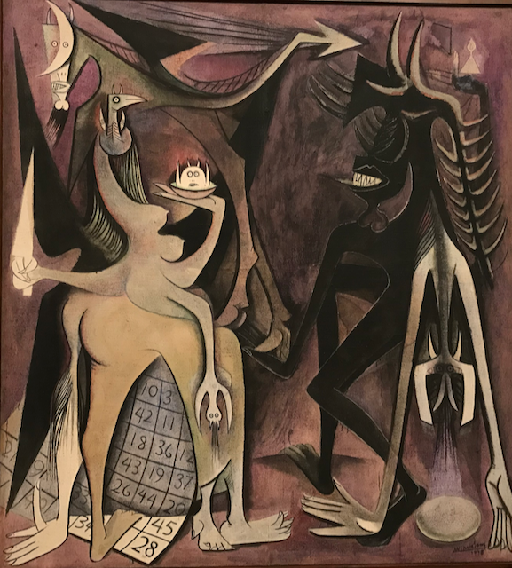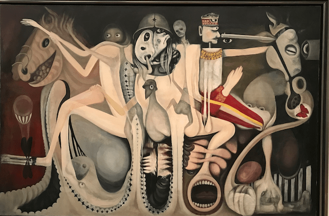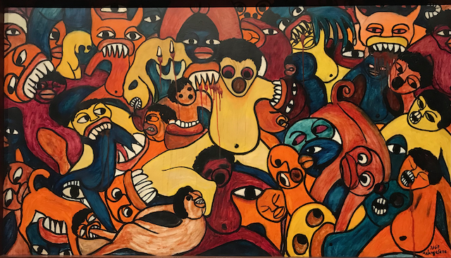 I was immediately drawn to the colours in this…then I got up closer and really had a look! Still rather like it. Painted by Malangatana Ngwenya drawing on his experiences in Mozambique during the fight for independence from Portugal