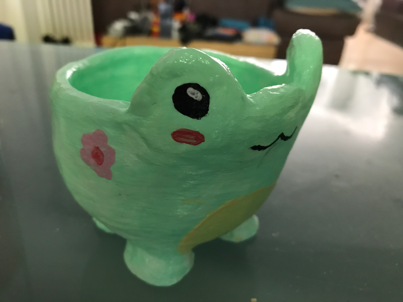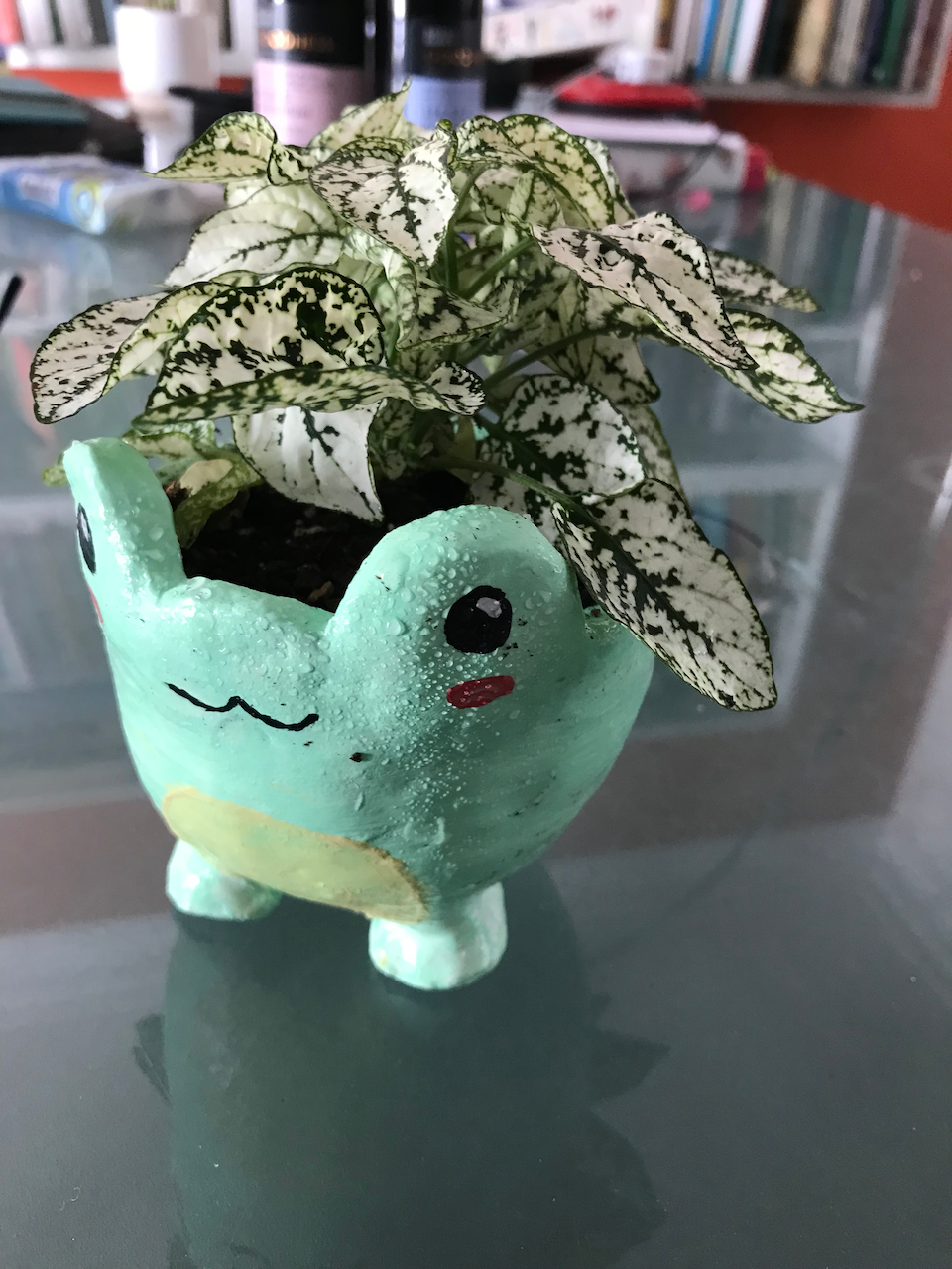 Anyway, I gave it a go…modelled on an image I found on the internet. It has come out ok…other than the fact it looks like the frog has a moustache. Gave it to my daughter with a nice mosaic plant in it.