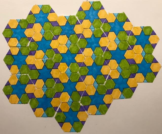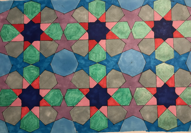 This one is a pattern from Esfrefoglu Mosque in Turkey. What I hadn’t realised when I started was that the shape wasn’t square, it was hexagonal, meaning that repeating the pattern wasn’t as straightforward as the first pattern. I eventually created individual tiles, cut them out and then stuck them down. Worked ok, but was fiddly and because I’m not precise enough, there end up being gaps in the final pattern. I’m sure if I think about it more I can repeat the pattern without using this method.