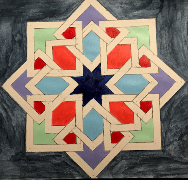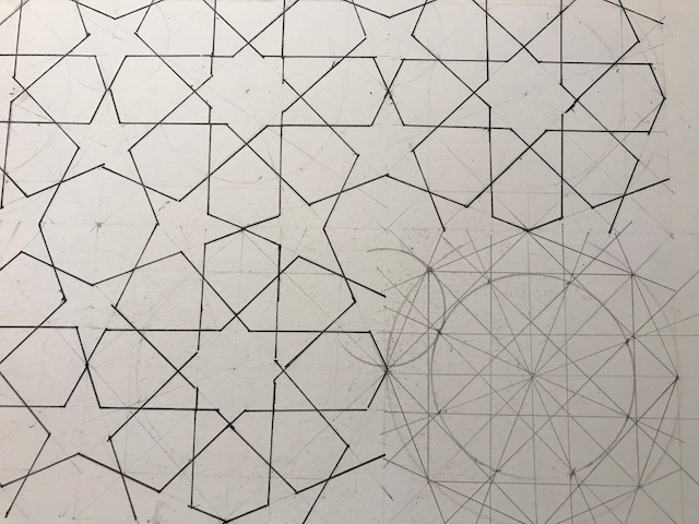 This looked like one of the simplest patterns in the book, a pattern from the Great Mosque of Cordoba in Spain. And it was indeed, pretty simple…although it had been a long time since I used a compass. The end result is pretty pleasing, even if it’s a bit rough around the edges.