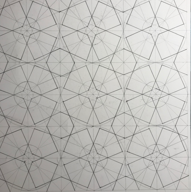 Drawing the pattern was really simple but thickening up the lines took an age. The easiest way to to it is to draw a small circle at every intersection and then join them all up. In the end, I just couldn’t draw a small circle with my compass so I ended up measuring and drawing all the lines. Pretty tedious and time consuming. I also drew the main lines in pen so I couldn’t erase them.