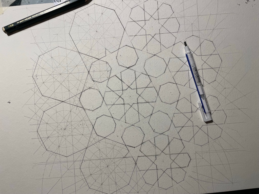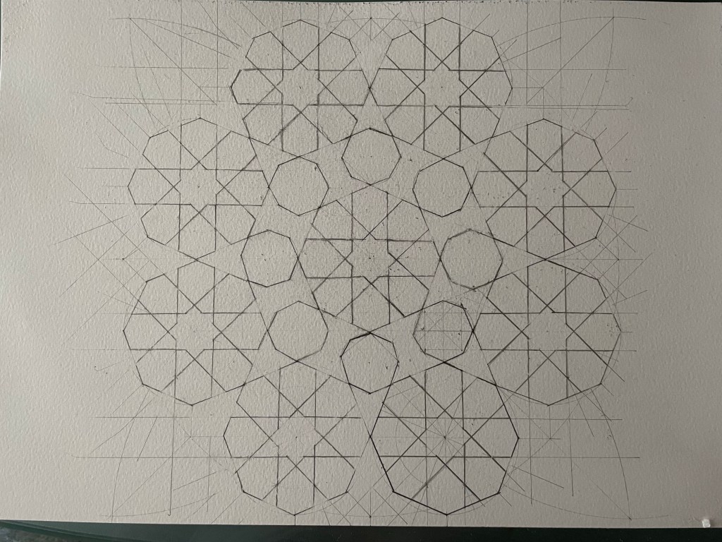 I’ve been doing quite a lot of my designs from a book called Islamic Geometric Patterns by Eric Broug. It’s not necessarily very highly rated by those who know about these things but it has been great starting out with that. I’ve also been scouring the internet for material and my favourite place is probably Samira Mian’s website. From there, I found out about Sandy Kurt, another artist and teacher and this time my efforts are from one of the free PDFs on her website.