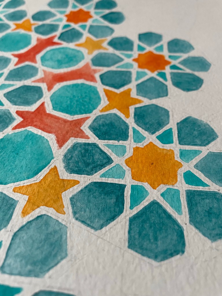 I drew on A3 watercolour paper as I wanted to colour in watercolours. I’m glad I did it this big as it was quite an intricate construction (for me). It took me just a bit over 2 hours to draw out. It was quite straightforward but, as usual, my little inconsistencies crept in here and there. It was enjoyable to do though and didn’t involve tracing and tiling which I’ve been doing a lot of recently.