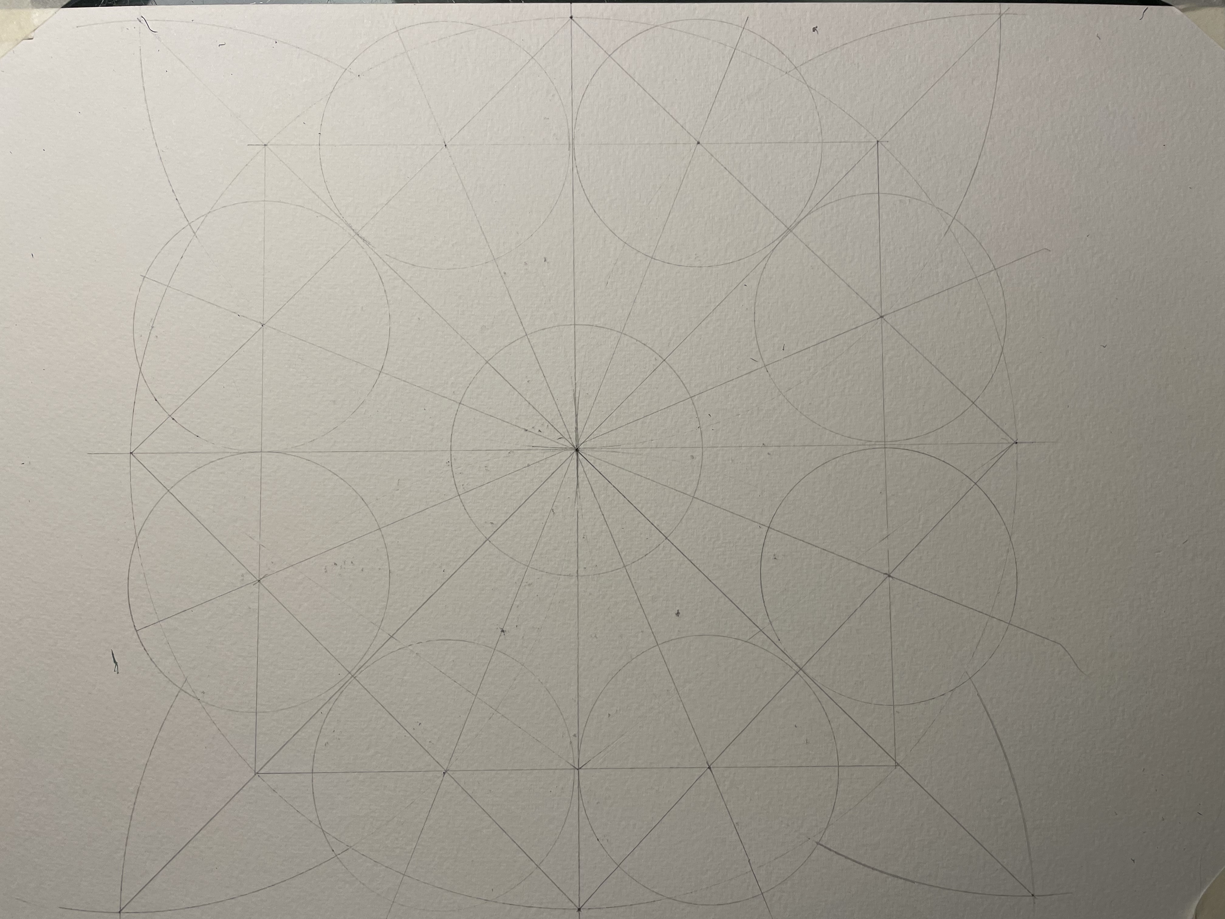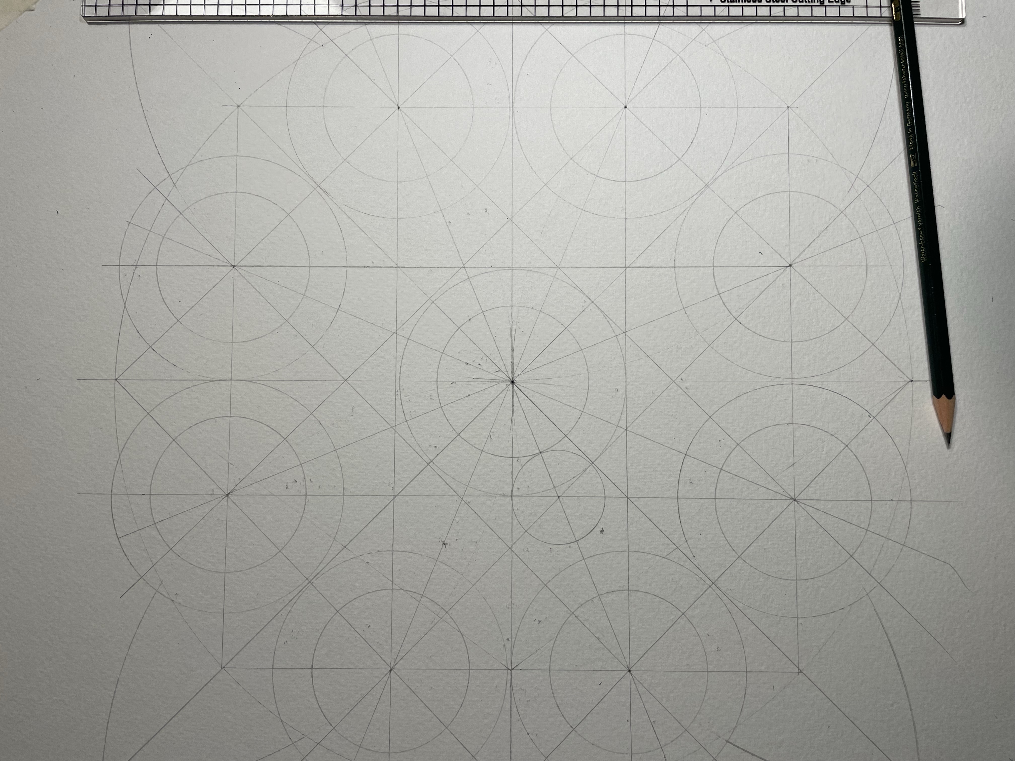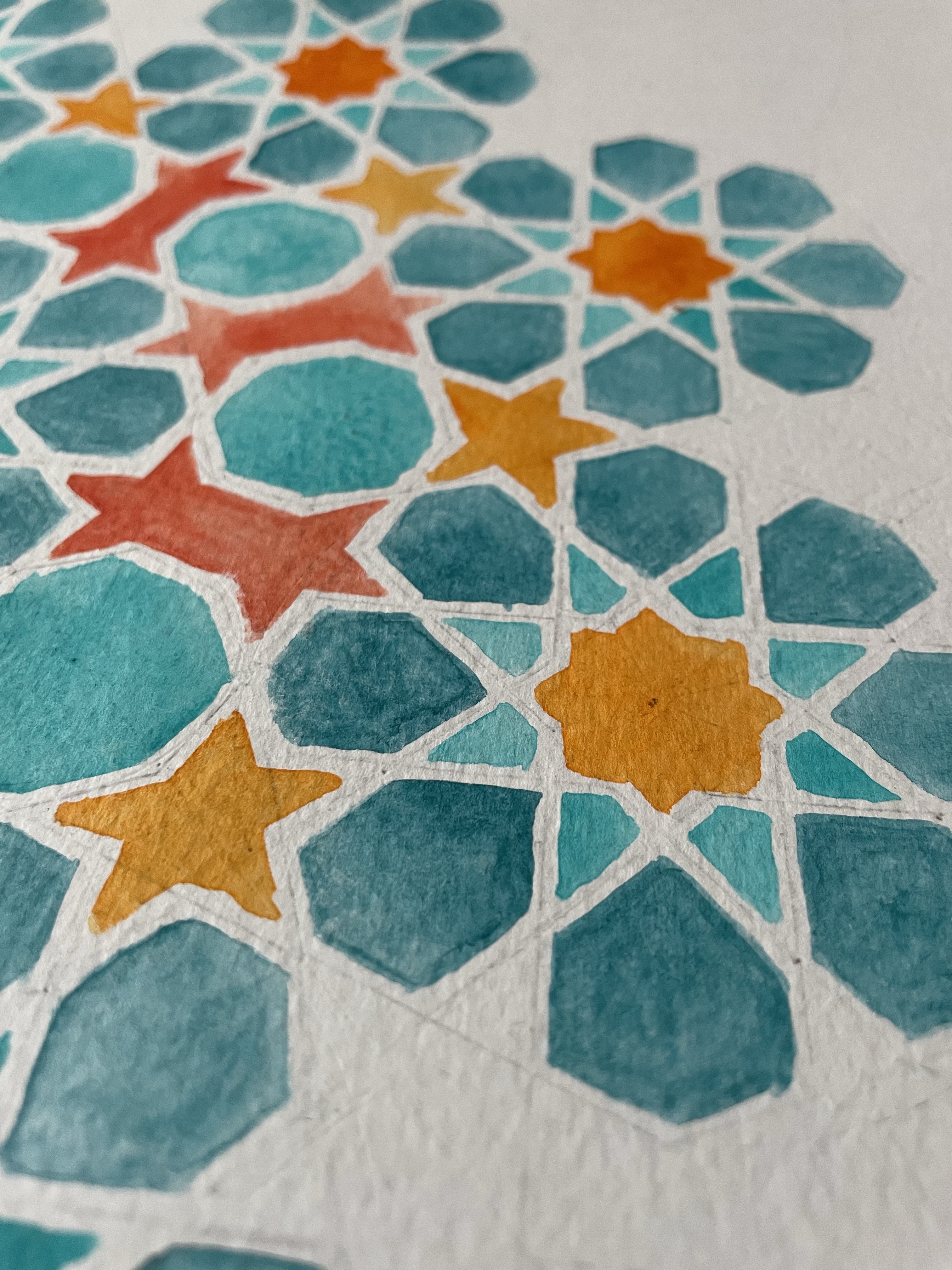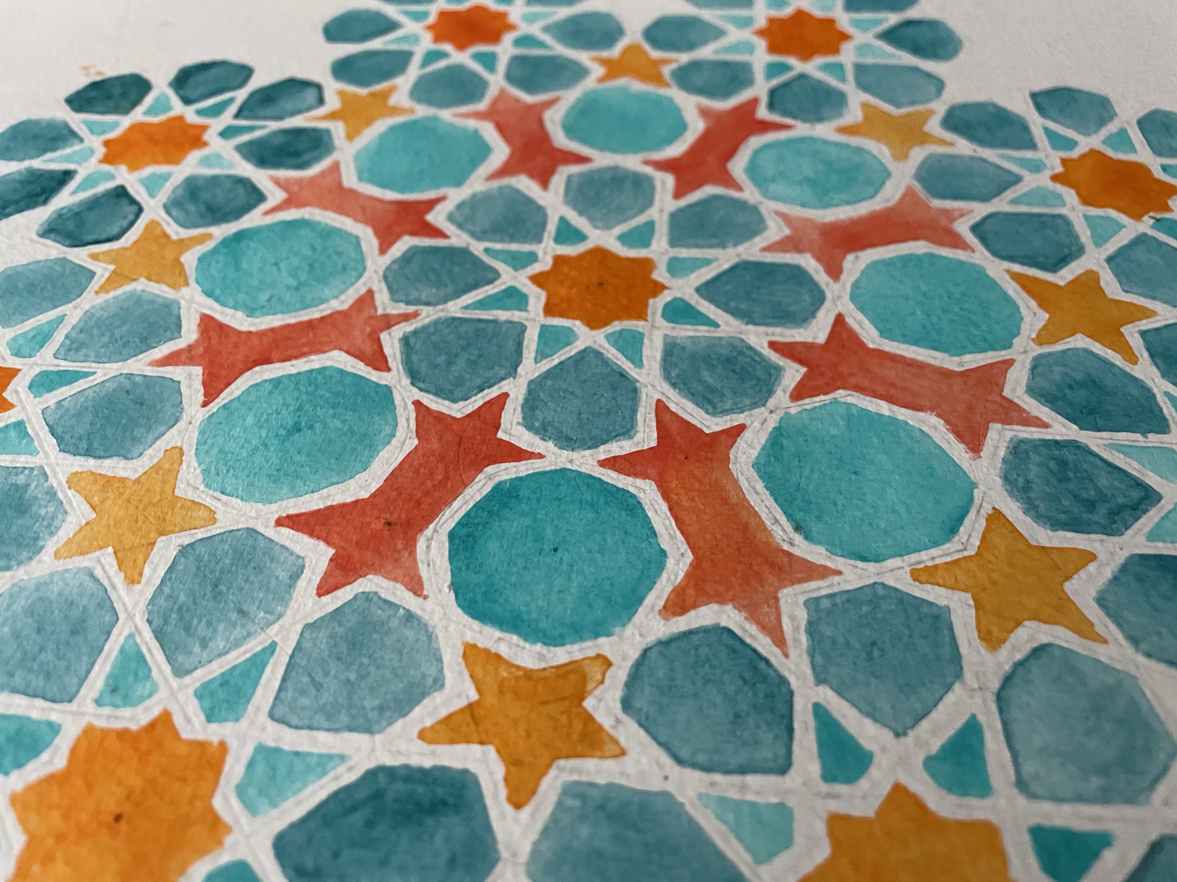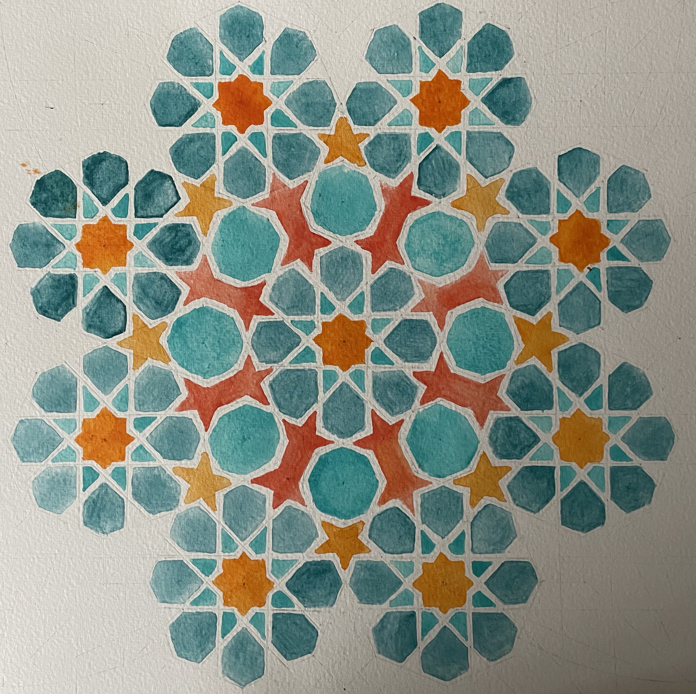 I drew on A3 watercolour paper as I wanted to colour in watercolours. I’m glad I did it this big as it was quite an intricate construction (for me). It took me just a bit over 2 hours to draw out. It was quite straightforward but, as usual, my little inconsistencies crept in here and there. It was enjoyable to do though and didn’t involve tracing and tiling which I’ve been doing a lot of recently.