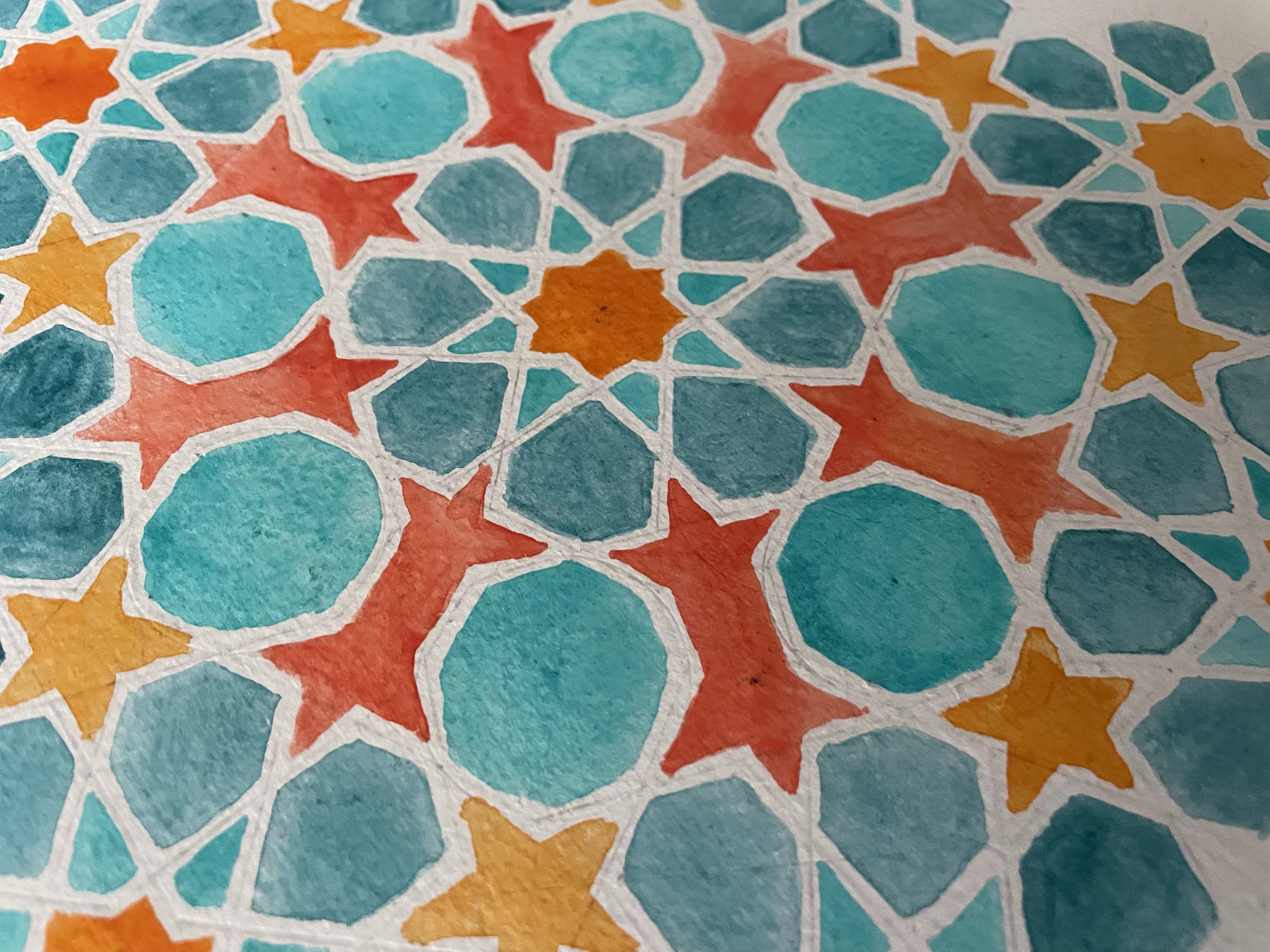 I’ve been doing quite a lot of my designs from a book called Islamic Geometric Patterns by Eric Broug. It’s not necessarily very highly rated by those who know about these things but it has been great starting out with that. I’ve also been scouring the internet for material and my favourite place is probably Samira Mian’s website. From there, I found out about Sandy Kurt, another artist and teacher and this time my efforts are from one of the free PDFs on her website.