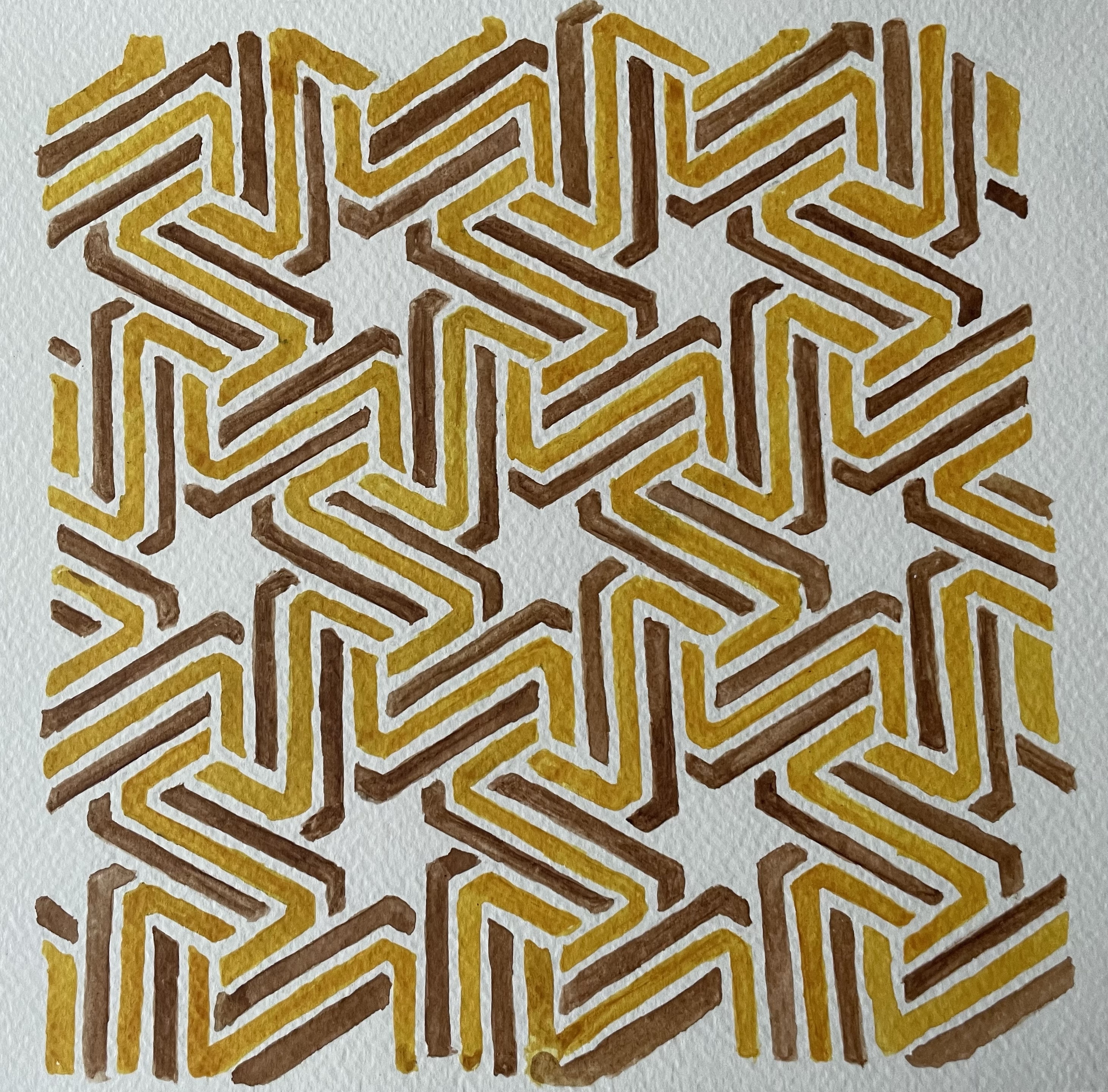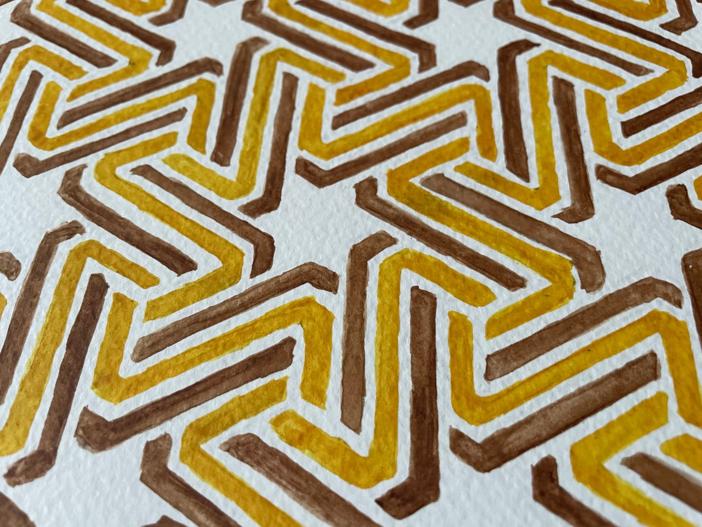 Another pattern from the “24 patterns for drawing the Alhambra” book. Details of the book are in a previous post. This one is a mural called the “Bath of Comares”. The original is formed by red lines on a light background and isn’t coloured. I chose to block in the lines and in choosing the brown and yellow I’ve managed to create something with a real 1970’s feel.