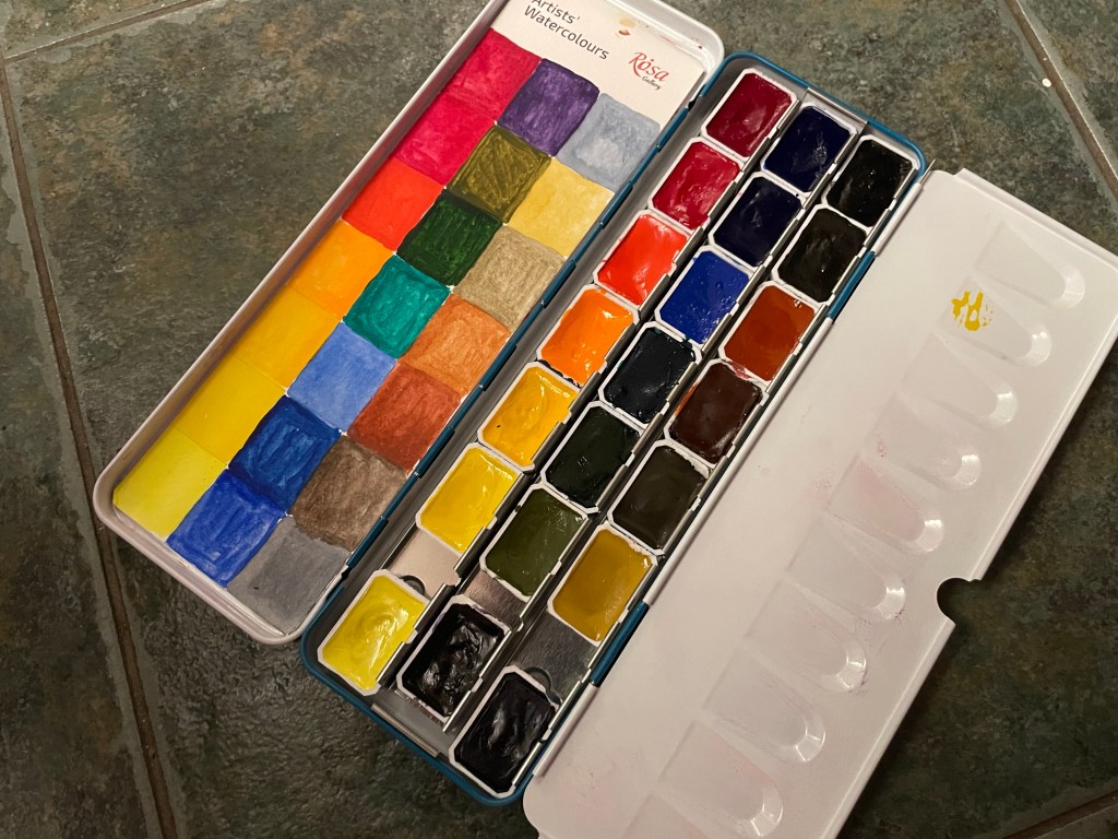Of course, I hadn’t been able to resist a Cass Art sale (there’s always a sale at Cass Art and I’m a sucker) so I’d bought this new box of paints. 21 full pans of vibrant colour. I love them. I’m not entirely sure I made the right colour choice here though. (I mentioned where I found out about these great paints in a previous post…Introducing Rosa Gallery Ukrainian Watercolours on the Ken Bromley Art Supplies website)