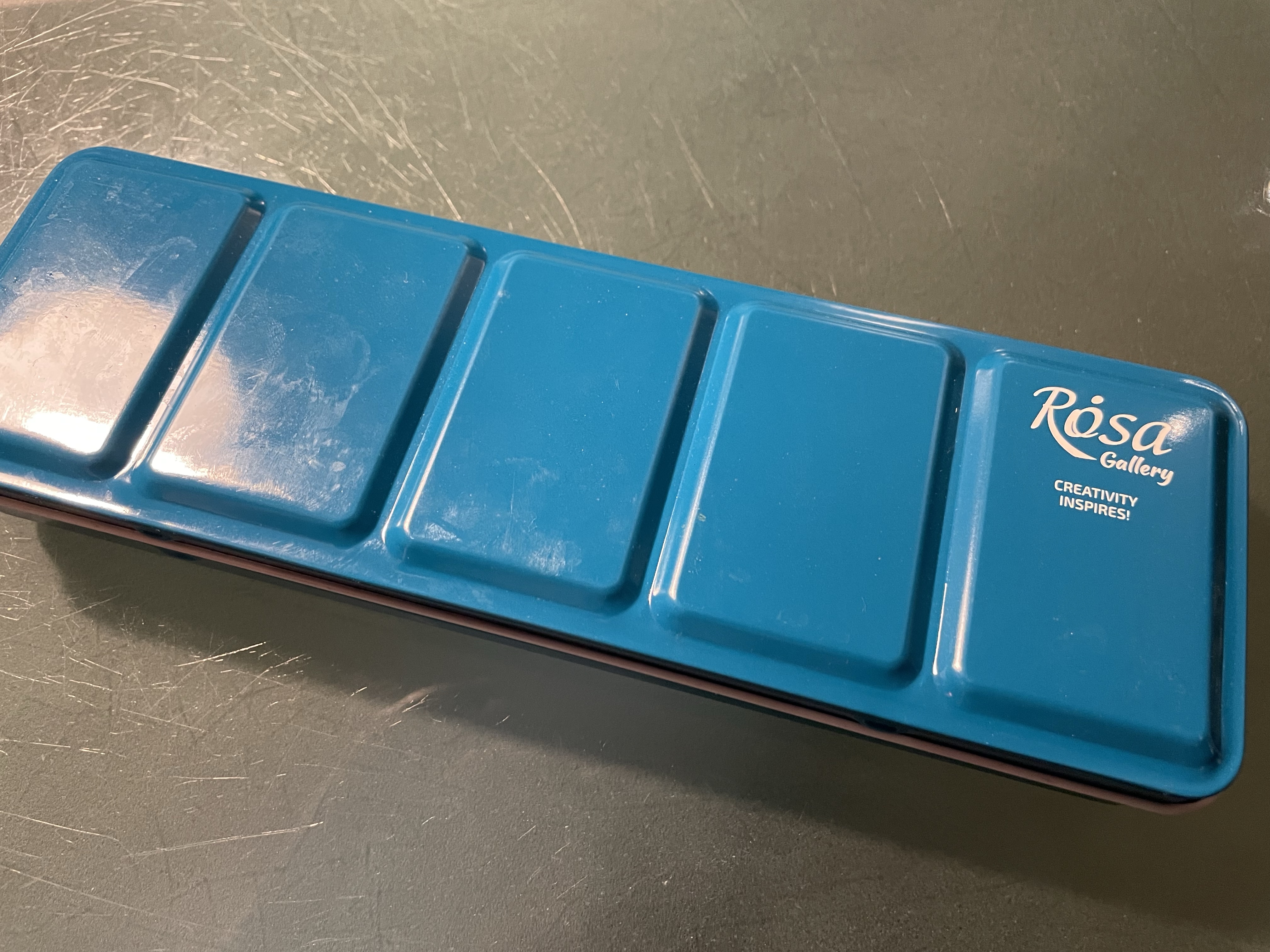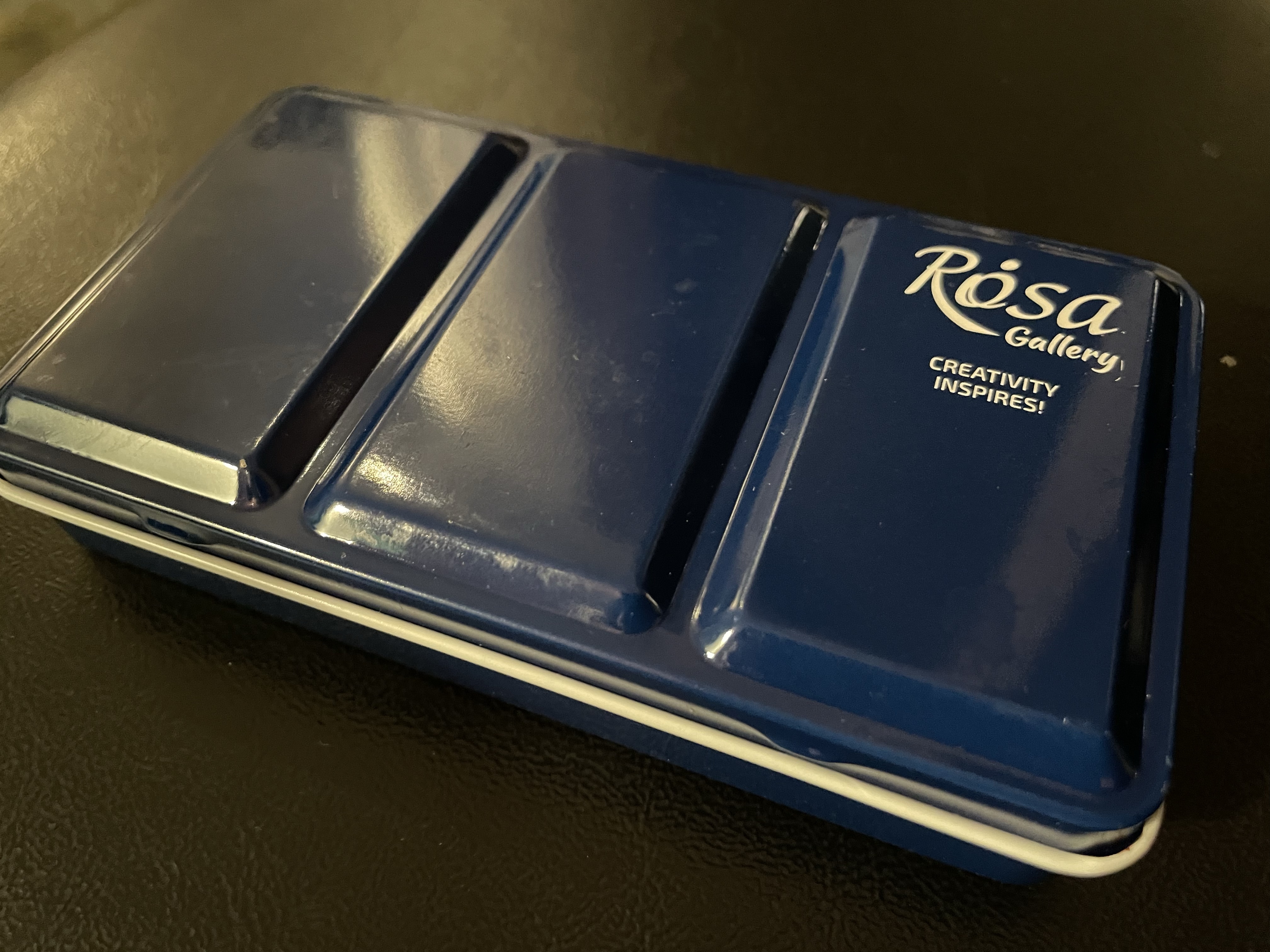 This time I returned to my trusty Winsor and Newton half pan paints. I really like the selection of blues in this. These came in a large set in a dreadful plastic box that was almost impossible to open. Fortunately, Rosa sell some empty tins that you can put pans in to, their paints are full pan but the half pans fit well. I’ve ditched the useless plastic box in favour of these tins. Each of the small size tins holds 21 half pans. I got these from the London Graphic Centre. Love them.