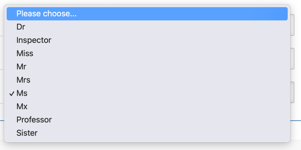 As part of setting up these accounts I obviously have to supply a variety of details and so I come to the title of this post. What is the obsession with stating a title? Not only that with having to state a title. Here’s an example from one of the systems…