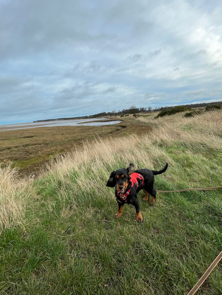 We reached the edge of Belhaven Bay and could almost see the sea. Dog’s ears show how windy it is. Luckily the wind was at our backs.