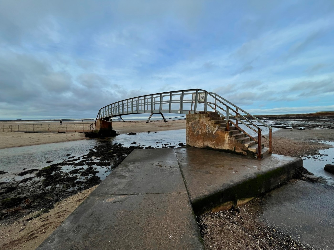 We then headed across the flats, towards the wide expanse of beach. A series of wooden bridges took us across the streams. Dunbar is just on the horizon.